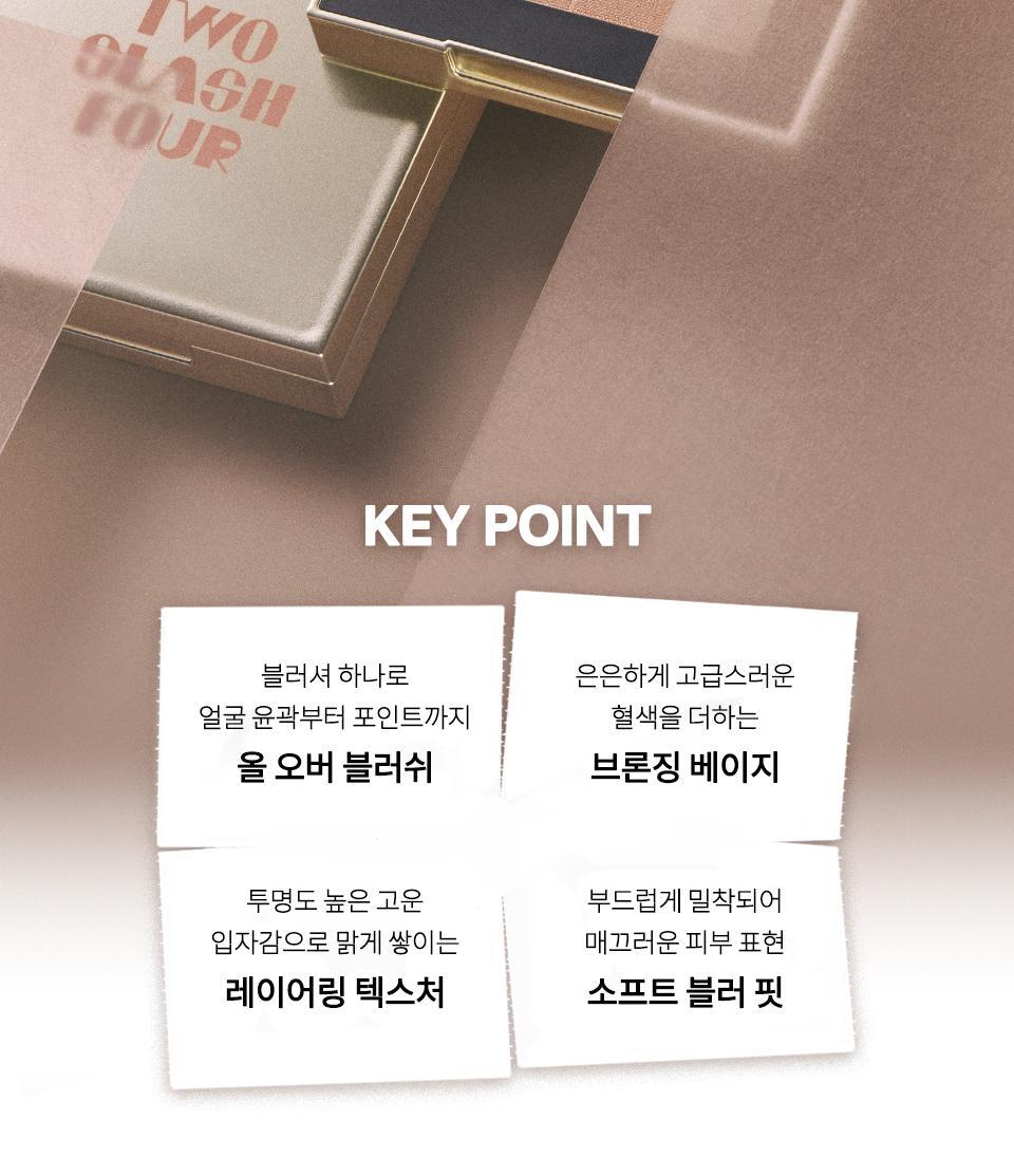 | [NEW/韓國著名美妝師 이사배 (Risabae)彩妝品牌]Two Slash Four 的全方位修飾腮紅 Two Slash Four 的全方位修飾腮紅(由美妝博主 RISABAE 創立)是一款主打細緻柔焦效果的產品, 適用於腮紅、打亮及修飾膚色。 該產品設計輕盈,即使疊擦也能維持清透妝感。 |